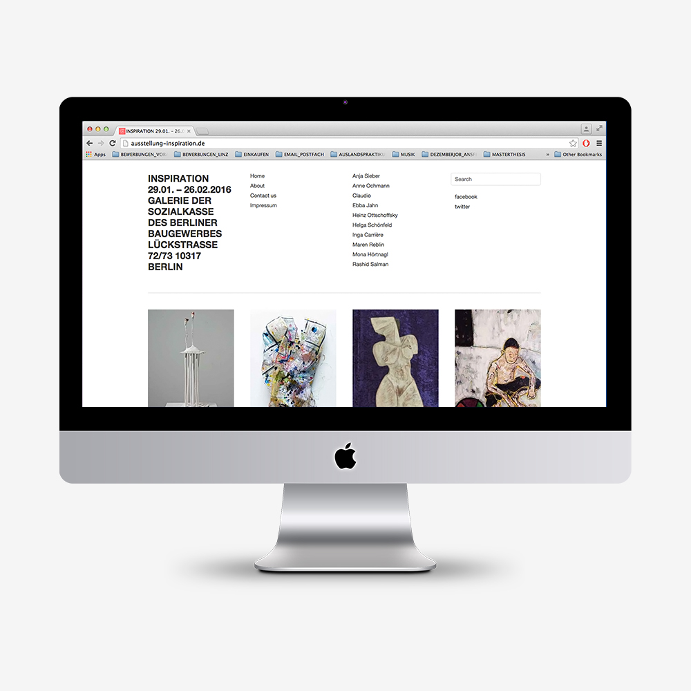 I was participating in a group exhibitionin Berlin. with the topic inspiration. This exhibition was placed in the Galerie der Sozialkasse, the street is called Lückstrasse 72/73 in 10317 Berlin Lichtenberg. I designed the flyer and made a website via wordpress: www.ausstellung-inspiration.de